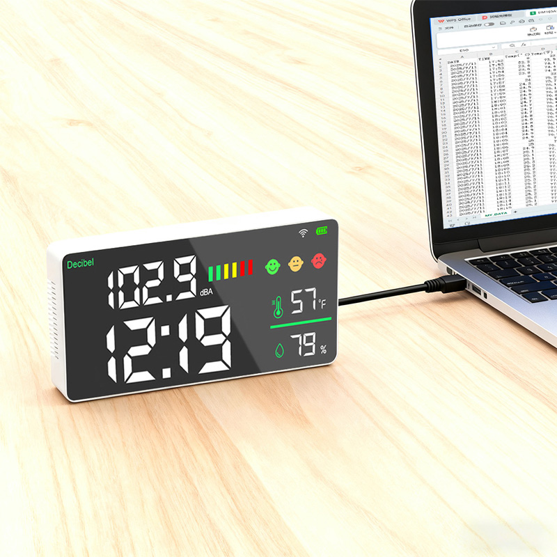 This product is a sound level decibel noise meter 5 in One . It adopts advanced acoustic sensors and precise measurement technology,real-time display noise, time ,temperature and humidity on its LED screen . It is with the 3-color emoji and bar symbols, which visualizes the noise level.