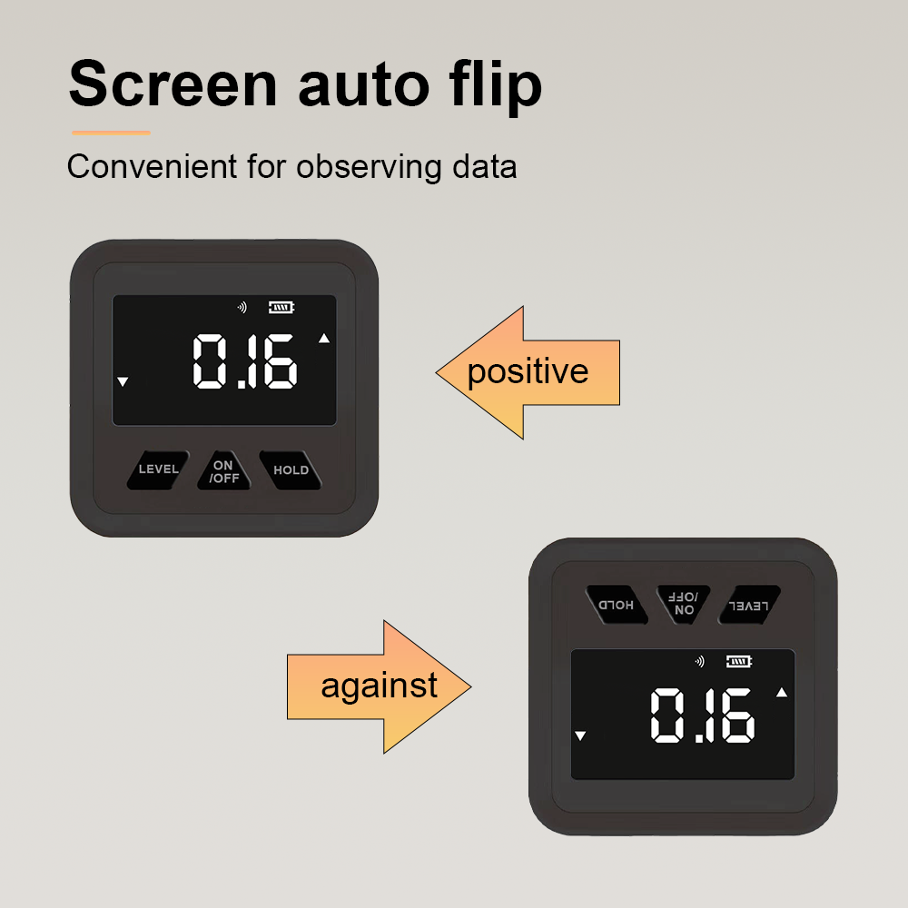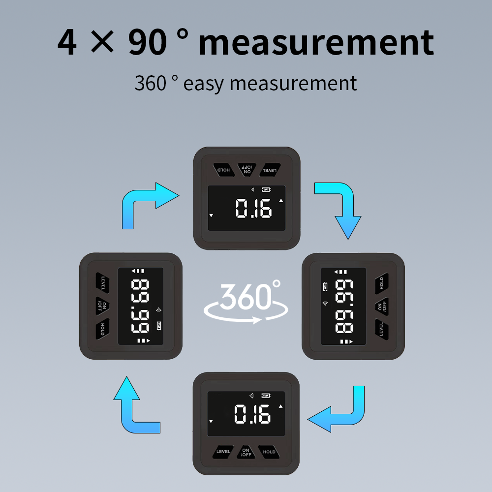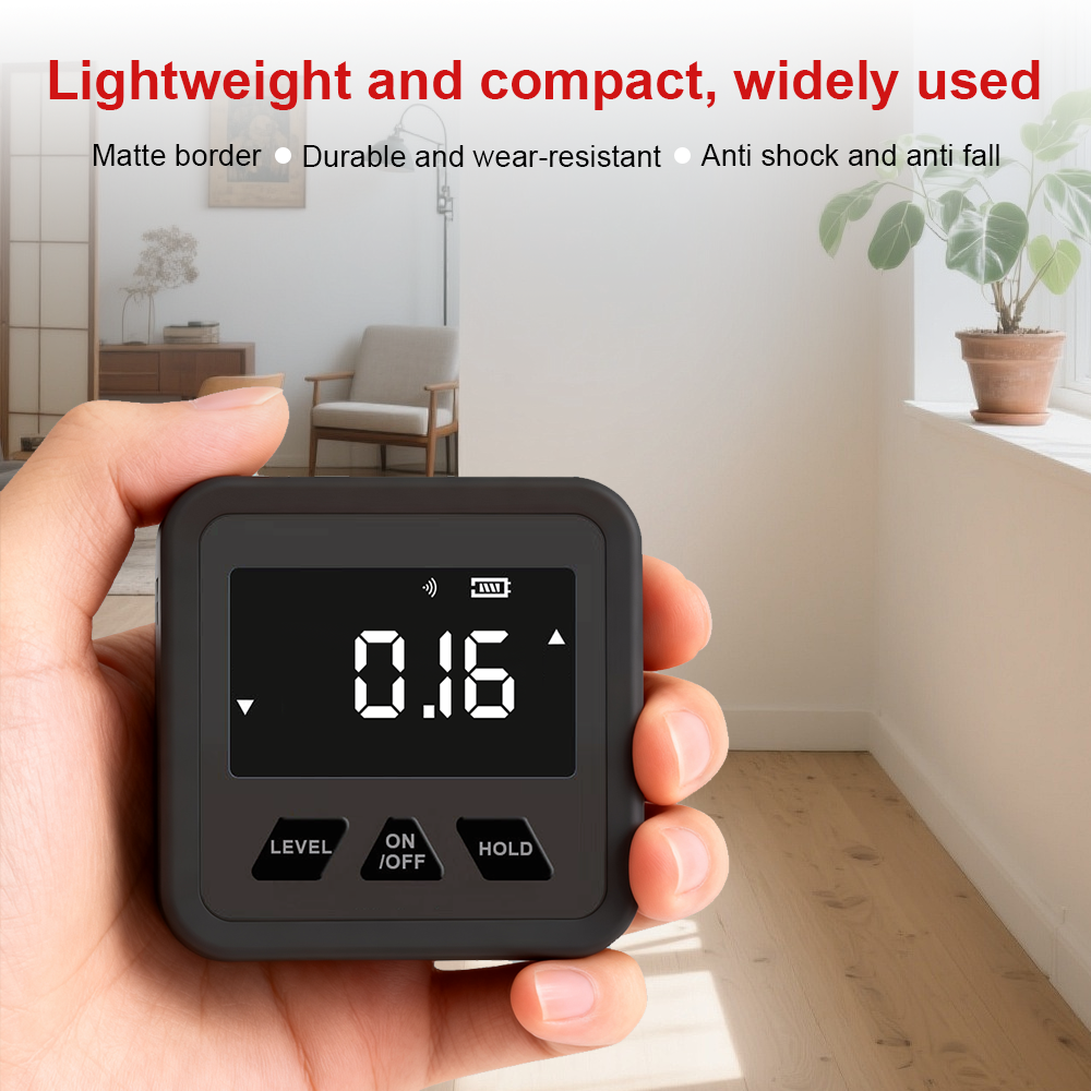 This electronic mini angle gauge features a core of ±0.2° measurement accuracy and 0.05° high resolution, equipped with a strong magnetic base that securely attaches to ferromagnetic metal surfaces like iron and steel, freeing hands for efficient operation. Its high-brightness LCD screen supports a backlight mode, ensuring clear readings in both strong light and dim environments. With a compact size of 56×54.6×27.5mm and a weight of only 40-60g, it is highly portable and suitable for multiple scenarios such as woodworking cutting, construction leveling, and machinery calibration. Balancing professional needs and daily use, it is a practical tool for precise measurement.